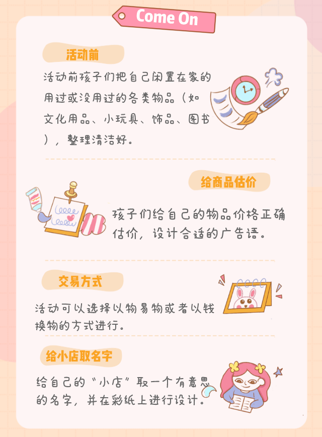 活动时间:5月21日,下午13:00-15:00 活动地点:吴兴区星火外滩广场 活动流程: (1)13:00前到达活动场地并在签到台进行签到 (2)13:00-13:30签到完成后家长和孩子到达指定活动场地进行布置和准备(物品摆放、贴好价签、放置招牌等) (3)13:30-14:30活动开始,孩子们开始以自己独特的方式推销自己的商品,进行买卖交易 (4)14:30-15:00整理清点商品,计算获利,体验感总结,拍照留念并领取活动方提供的小奖品以表彰孩子们的努力与参与热情 报名条件:年龄范围6-12岁小孩子,具有一定对理财交易的知识基础 活动准备: 家长帮助孩子提前整理好打算交易出售的闲置物品,制作价格标签为各类商品标价; 自备摊位地垫、便签纸、笔、小喇叭等需要的活动道具,准备适应量的零钱(20元以内,如1元、5元、10元)或者打印一张收款二维码; 为自己的小摊位起好“摊位名称”,设计标语、广告牌等有助于销售的辅助工具 温馨提示: 1、请家长和孩子一起将家里囤积多时的玩具、图书等闲置物品整理出来,清洗、消毒,确保安全、卫生;请让孩子一起参与,学会整理自己的物品。 2、和孩子一起对闲置物品估价、贴签;家长要征求孩子的意见噢! 3、这个活动是和有趣的游戏,不妨策划一下推销用语,培养幼儿大胆与人沟通、交流的能力 4、可以教他们认识钱币、学习简单的换算、加减,体验买、卖的真实过程,培养孩子的理财能力也使他们明白一个道理:财富是要靠劳动来创造的。 5、家庭成员齐参与,多点人来,有的看摊、有的带孩子到处转悠寻找自己感兴趣的东东。提前准备好零钱,年纪偏小的孩子需在家长指导下进行交易。 6、本活动各家庭都不是以赚钱为目的,价格要适中。 7、活动当天一定热闹非凡,请家长照顾好自己小孩的安全。 望子成龙望女成凤的宝爸宝妈 希望孩子琴棋书画样样精通 文能提笔安天下,武能马上定乾坤 可惜想学的课程那么多... ???????????????????? 不用担心!教育联盟卡虽迟但到! 9.9元抢教育联盟暑期体验课大礼包! 参与商户:瑞动体育、星跃运动、爱格体能、MAX街舞、安其拉舞蹈、泰尼思网球、果核音乐。 扫码抢购 内容包含:暑期体验课!一共7家,任选3家(每家体验2节课)上6节 *客户购买成功至星火外滩广场四楼商管中心进行核销后领取课程体验卡。与培训商家预约时间,本次活动仅限新生参加,一位小朋友一个名额,不可分开。 地址:星火外滩广场四楼商管中心(9:00-11:00,13:00-17:30) 咨询电话:15980852005 购买时间:即日起 - 5月22日 核销兑换时间:截止6月30日 课程体验有效期:即日起到7月30日 一、果核音乐(*两节体验课不可选同一门课程) ①架子鼓、民谣吉他、电吉他、声乐(适龄阶段:小学1年级及以上) ②尤克里里、非洲鼓(适龄阶段:幼儿园中班及以上) 二、爱格体能 课程:少儿体适能、平衡车体验课(每节精品小班课60分钟为1节,共2节) 体验年龄:体适能课程年龄要求 2—6周岁 平衡车课程年龄要求 2—5周岁 三、瑞动体育 课程:篮球课、体能课(适龄阶段:幼儿园、小学) 四、星跃运动 课程:零基础跳绳,田径训练课,中考体育课程,综合体能训练课(适龄阶段:年龄5周岁以上) 五、泰尼思网球 课程:网球零基础教学、学习正手击球、球场脚步练习(适龄阶段:年龄5周岁以上) 六、MAX街舞 课程:幼儿街舞/爵士舞,少儿街舞/爵士舞,青少年街舞韩舞,成人爵士舞 课程适龄:幼儿园的小朋友,少儿就是小学生,青少年就是初高中,成人就是成年人。 七、安其拉艺术培训中心 课程:启蒙班基本功及舞蹈小游戏。 年龄:满三周岁适龄儿童(有过舞蹈基础的孩子也可到适龄班级体验) 号外!号外!号外! 在星火外滩广场将举办新①期 【湖州亲子大本营】跳蚤市场 5.21与你们不见不散~ 将孩子不再喜欢的玩具、书籍、手工等闲置物品,放到儿童跳蚤市场上出售/交换。为它们找到新的主人,还能更好的培养孩子们的表达能力、组织能力、理财能力,提高参与社会实践活动的积极性。家长们带着宝宝来参加吧~ 扫码抢购 活动时间:5月21日 13:00-15:00 活动流程:*现场有惊喜小礼品领取! (1)13:00到达活动场地签到 (2)13:00-13:30到达活动场地布置、准备(物品摆放、贴好价签、放置招牌等) (3)13:30-14:30正式开始,孩子们积极推销自己的商品,进行买卖交易 (4)14:30-15:00整理清点商品,计算获利,体验感总结,拍照留念并领取活动方提供的小奖品以表彰孩子们的努力与参与热情 自备摊位地垫、便签纸、笔、小喇叭等需要的活动道具,准备适应量的零钱(20元以内,如1元、5元、10元)或者打印一张收款二维码; 1、不妨策划一下推销用语,培养幼儿大胆与人沟通、交流的能力 2、可以提前教他们认识钱币、学习简单的换算、加减,体验买、卖的真实过程,培养孩子的理财能力也使他们明白一个道理:财富是要靠劳动来创造的。 3、活动当天一定热闹非凡,请家长照顾好自己小孩的安全。 小萌宝化身小掌柜,开启生意之旅。他们精心布置自己的“门店”,摆上宝贝,给每件商品明码标价。有的还用画板、彩笔等创作了宣传海报,为摊位增添了一道靓丽的风景线。 一次跳蚤市场,全家创意总动员,劲爆促销层出不穷!小朋友们激情高昂,招待不断涌入现场的顾客,活动现场真是异常火爆。 -商务合作- 【迦米】 18268258392 【石榴】 13002616866 ▼百鱼团爆款推荐▼ ↓↓↓戳原文,一键加入百鱼团福利群